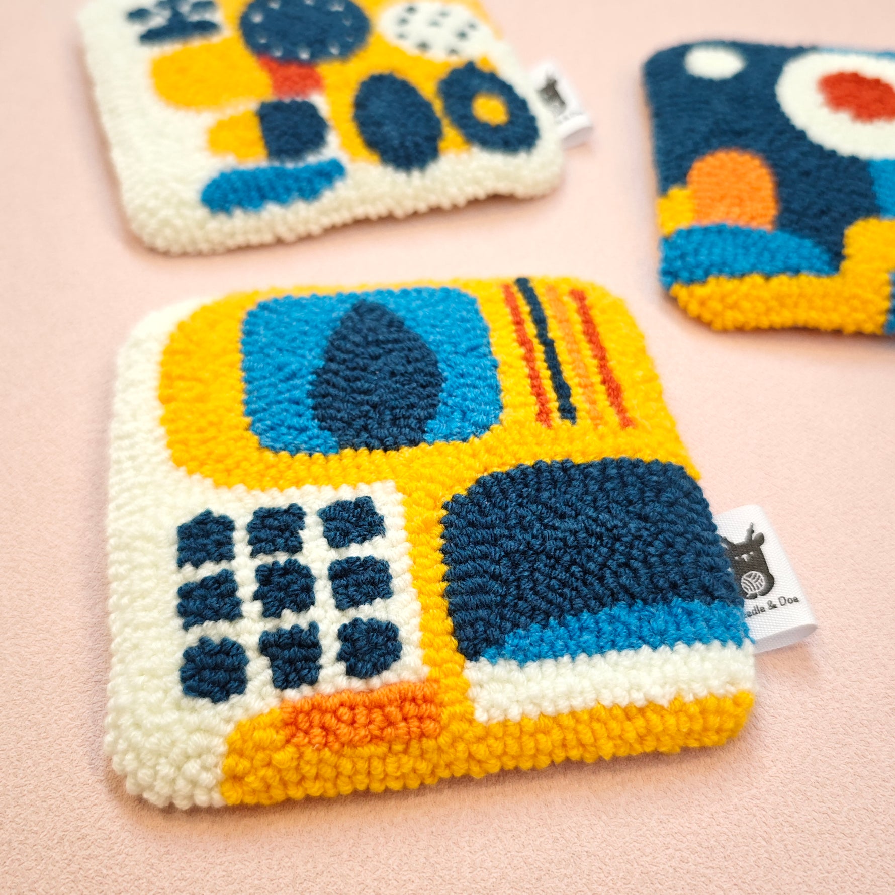 The "Radiant Reflections" series of handmade punch needle coasters features a yellow color theme, blending elements of abstraction, nature, and plants. Each coaster is a unique handmade piece.