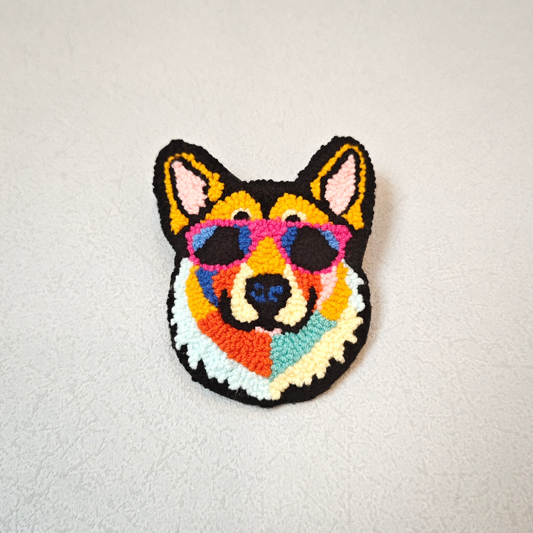 This handmade punch needle German shepherd brooch features a vibrant mix of colors blended together. The German shepherd adorned with sunglasses on the brooch exudes a cool and personalized style. This beautiful and whimsical accessory is sure to add a touch of playfulness to your outfit.